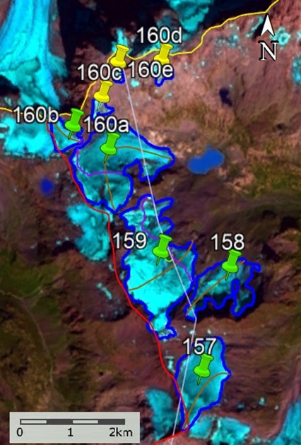 სურ. 6. №157 − 160 მყინვარების კონტურები: ა − ტოპოგრაფიული რუკის მიხედვით, ბ − Landsat 7 ETM+ სენსორის 2010 წლის 31 აგვისტოს სურათის მიხედვით, გ − Landsat 8 OLI TIRS სენსორის 2015 წლის 5 სექტემბრის სურათის მიხედვით, დ − Landsat 8 OLI TIRS სენსორის 2020 წლის 11 სექტემბრის სურათის მიხედვით.