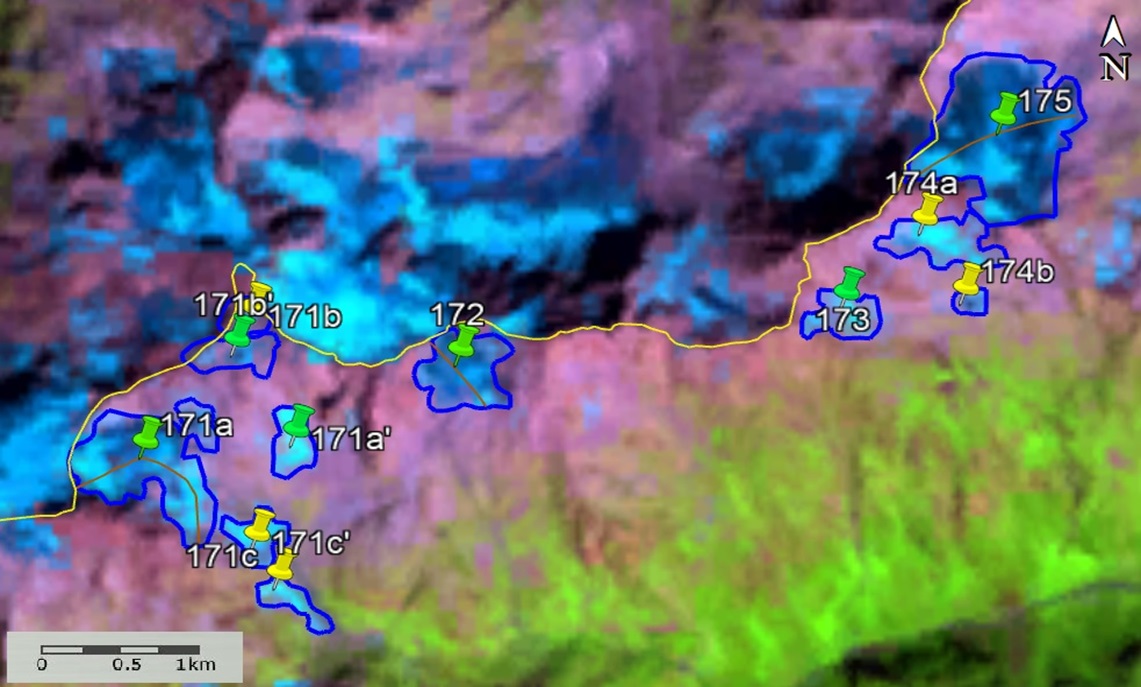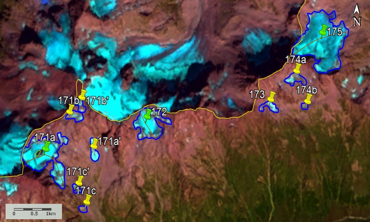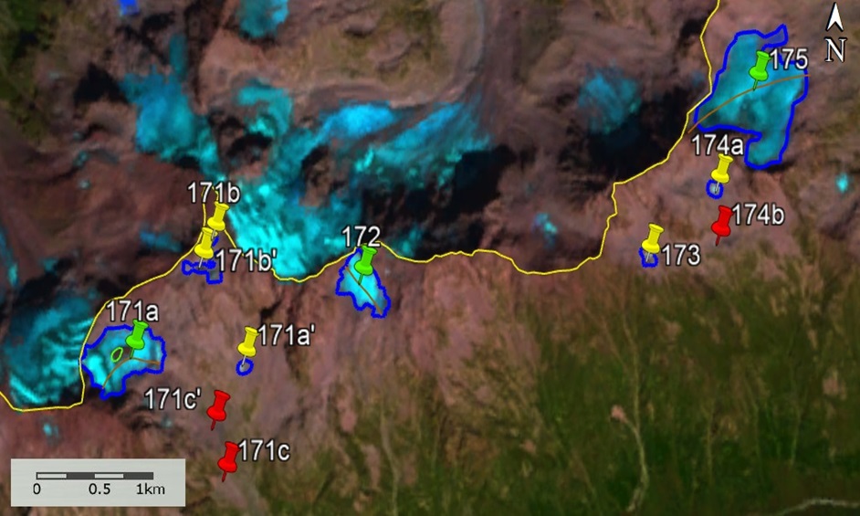 სურ. 10. №171 – 175 მყინვარების კონტურები: ა − ტოპოგრაფიული რუკის მიხედვით, ბ − Landsat 7 ETM+ სენსორის 2010 წლის 31 აგვისტოს სურათის მიხედვით, გ − Landsat 8 OLI TIRS სენსორის 2015 წლის 5 სექტემბრის სურათის მიხედვით, დ − Landsat 8 OLI TIRS სენსორის 2020 წლის 11 სექტემბრის სურათის მიხედვით.