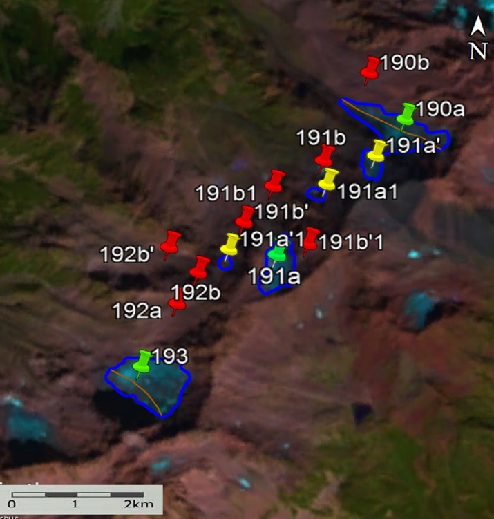 სურ. 15. №190 − 193 მყინვარების კონტურები: ა − ტოპოგრაფიული რუკის მიხედვით, ბ − Landsat 7 ETM+ სენსორის 2010 წლის 31 აგვისტოს სურათის მიხედვით, გ − Landsat 8 OLI TIRS სენსორის 2015 წლის 5 სექტემბრის სურათის მიხედვით, დ − Landsat 8 OLI TIRS სენსორის 2020 წლის 11 სექტემბრის სურათის მიხედვით.