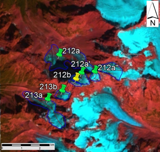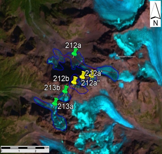 სურ. 25. №212 (სამხ. ლიადეშტი) და №213 მყინვარების კონტურები: ა − ტოპოგრაფიულ რუკაზე, ბ − Landsat 7 ETM+ სენსორის 2010 წლის 31 აგვისტოს სურათის მიხედვით, გ − Landsat 8 OLI TIRS სენსორის 2015 წლის 5 სექტემბრის სურათის მიხედვით, დ − Landsat 8 OLI TIRS სენსორის 2020 წლის 11 სექტემბრის სურათის მიხედვით.