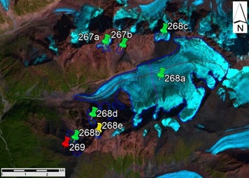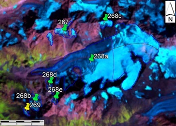 სურ. 38. №267, №268 (ყვითლოდი) და №269 მყინვარების კონტურები: ა − ტოპოგრაფიულ რუკაზე, ბ − Landsat 7 ETM+ სენსორის 2010 წლის 31 აგვისტოს სურათის მიხედვით, გ − Landsat 8 OLI TIRS სენსორის 2015 წლის 5 სექტემბრის სურათის მიხედვით და დ − Landsat 8 OLI TIRS სენსორის 2020 წლის 11 სექტემბრის სურათის მიხედვით.