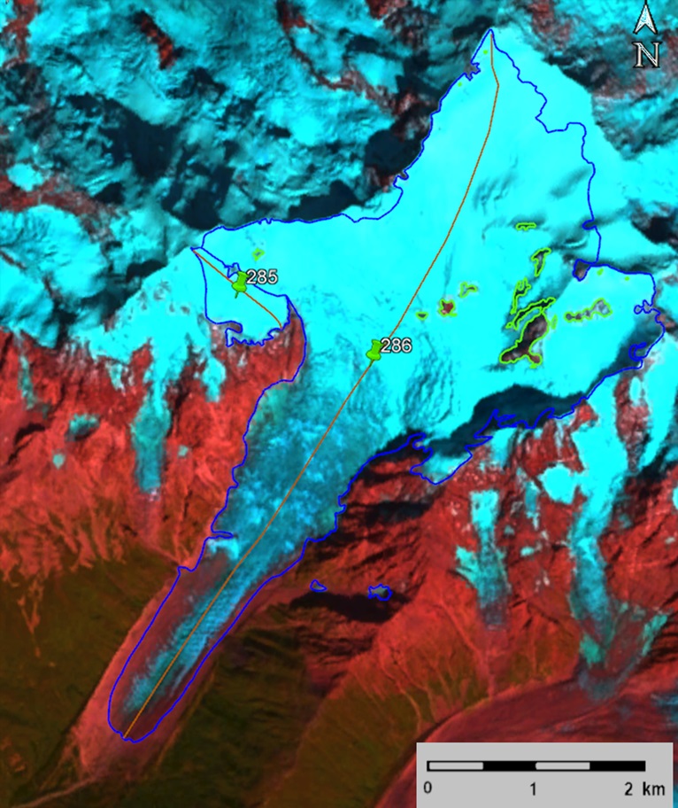 სურ. 42. №285 და №286 (ადიში) მყინვარების კონტურები: ა − ტოპოგრაფიული რუკის მიხედვით, ბ − Landsat 5 TM სენსორის 2011 წლის 19 სექტემბრის სურათის მიხედვით, გ − Landsat 8 OLI TIRS სენსორის 2017 წლის 12 სექტემბრის სურათის მიხედვით, დ − Landsat 8 OLI TIRS სენსორის 2020 წლის 4 სექტემბრის სურათის მიხედვით.