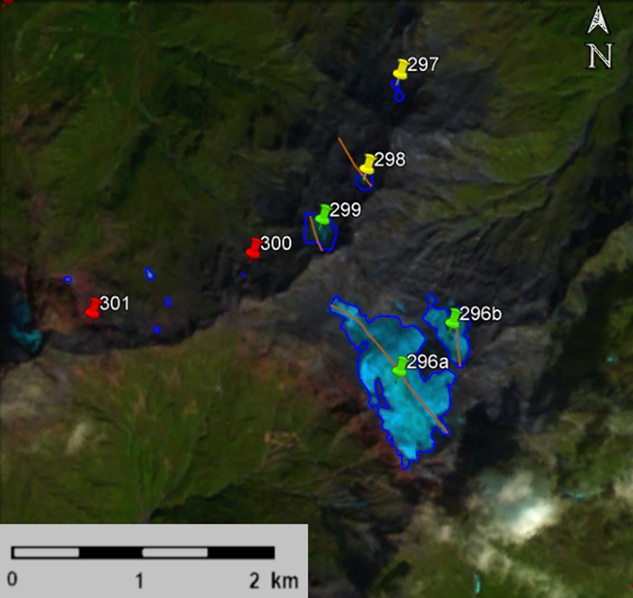 შენიშვნა: გ-ზე №300 მყინვარი დანაწევრდა 3 თოვლნარად და №301 მყინვარი − 6 თოვლნარად, რაც ასახულია ექსელის ფართობების ცხრილში. შემდეგ ვადაზე ეს თოვლნარები გამდნარია. ამიტომ სურათები, რომ არ გადაიტვირთოს არ ჩავარჭეთ შესაბამისი წითელი ქინძისთავები.
