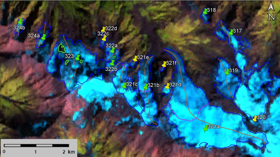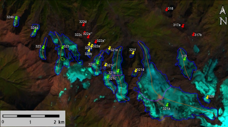 სურ. 48. №317 − 321 (ლაილა c) და №322 − 324 მყინვარების კონტურები: ა − ტოპოგრაფიული რუკის მიხედვით, ბ − Landsat 5 TM სენსორის 2011 წლის 19 სექტემბრის სურათის მიხედვით, გ − Landsat 8 OLI TIRS სენსორის 2017 წლის 12 სექტემბერის სურათის მიხედვით, დ − Landsat 8 OLI TIRS სენსორის 2020 წლის 11 სექტემბრის სურათის მიხედვით.