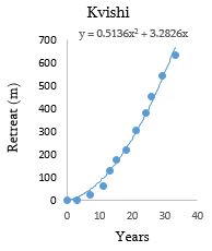 The positive solution of this equation is approximately 154. This result means that if the current trend of retreat continues, the Adishi Glacier will probably melt completely in 154 years, or in 2131 (the starting point is 1977).