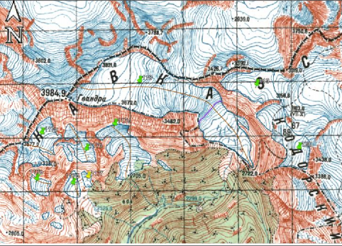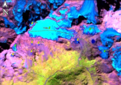 სურ. 16. №117 − 118 (საკენი), №119, №120 მყინვარების კონტურები: ა − ტოპოგრაფიულ რუკაზე, ბ − Landsat 5 TM სენსორის 2010 წლის 31 აგვისტოს სურათის მიხედვით, გ − Landsat 8 OLI TIRS სენსორის 2015 წლის 29 აგვისტოს სურათის მიხედვით, დ − Landsat 8 OLI TIRS სენსორის 2020 წლის 11 სექტემბერის სურათის მიხედვით.