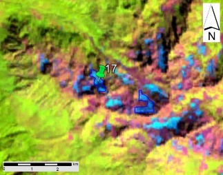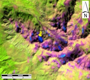 სურ. 1. №17 მყინვარის კონტურები: ა − ტოპოგრაფიულ რუკაზე, ბ − Landsat 7 ETM+ სენსორის 2010 წლის 31 აგვისტოს სურათის მიხედვით, გ − Landsat 8 OLI სენსორის 2015 წლის 5 სექტემბრის სურათის მიხედვით, დ − Landsat-ის 8 OLI TIRS სენსორის 2020 წლის 11 სექტემბრის სურათის მიხედვით.