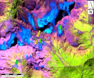 სურ. 2. №18 (ჩეგალი) − 20 მყინვარების კონტურები: ა − ტოპოგრაფიულ რუკაზე, ბ − Landsat 7 ETM+ სენსორის 2010 წლის 31 აგვისტოს სურათის მიხედვით, გ − Landsat 8 OLI სენსორის 2015 წლის 5 სექტემბრის სურათის მიხედვით, დ − Landsat-ის 8 OLI TIRS სენსორის 2020 წლის 11 სექტემბრის სურათის მიხედვით.