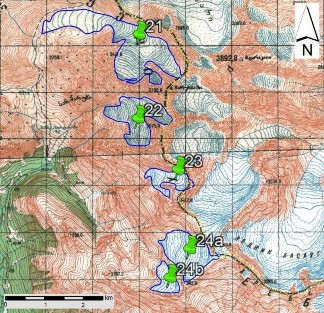 სურ. 3. №21 (მარუხი) − 24 მყინვარების კონტურები: ა − ტოპოგრაფიულ რუკაზე, ბ − Landsat 7 ETM+ სენსორის 2010 წლის 31 აგვისტოს სურათის მიხედვით, გ − Landsat 8 OLI სენსორის 2015 წლის 5 სექტემბრის სურათის მიხედვით, დ − Landsat-ის 8 OLI TIRS სენსორის 2020 წლის 11 სექტემბრის სურათის მიხედვით.