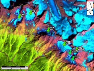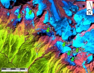 სურ. 4. №25 − 30 მყინვარების კონტურები: ა − ტოპოგრაფიულ რუკაზე, ბ − Landsat 7 ETM+ სენსორის 2010 წლის 31 აგვისტოს სურათის მიხედვით, გ − Landsat 8 OLI სენსორის 2015 წლის 5 სექტემბრის სურათის მიხედვით, დ − Landsat-ის 8 OLI TIRS სენსორის 2020 წლის 11 სექტემბრის სურათის მიხედვით.