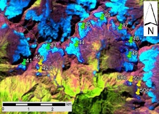სურ. 6. №41 − 46 (ჯუგურტურლუჩატი), №47 − 50 მყინვარების კონტურები: ა − ტოპოგრაფიულ რუკაზე, ბ − Landsat 7 ETM+ სენსორის 2010 წლის 31 აგვისტოს სურათის მიხედვით, გ − Landsat 8 OLI სენსორის 2015 წლის 28 აგვისტოს სურათის მიხედვით, დ − Landsat-ის 8 OLI TIRS სენსორის 2020 წლის 11 სექტემბრის სურათის მიხედვით.
