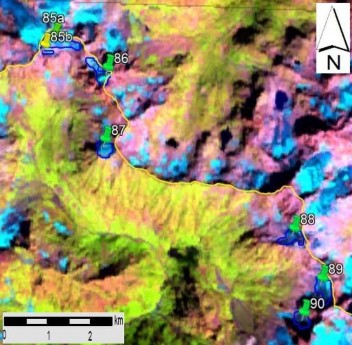სურ. 11. №85 − 90 მყინვარების კონტურები: ა − ტოპოგრაფიულ რუკაზე, ბ − Landsat 7 ETM+ სენსორის 2010 წლის 31 აგვისტოს სურათის მიხედვით, გ − Landsat 7 ETM+ სენსორის 2015 წლის 6 სექტემბრის სურათის მიხედვით, დ − Landsat 8 OLI TIRS სენსორის 2020 წლის 11 სურათის მიხედვით.