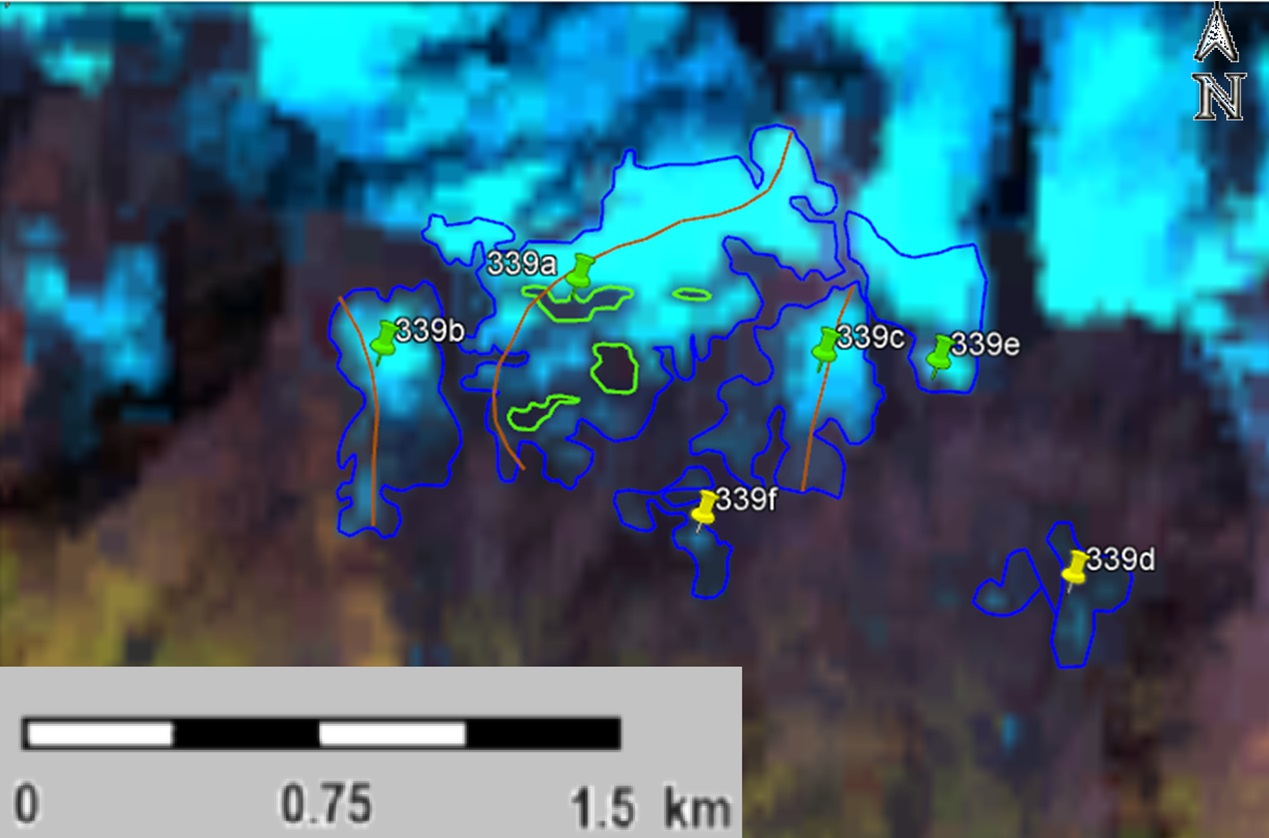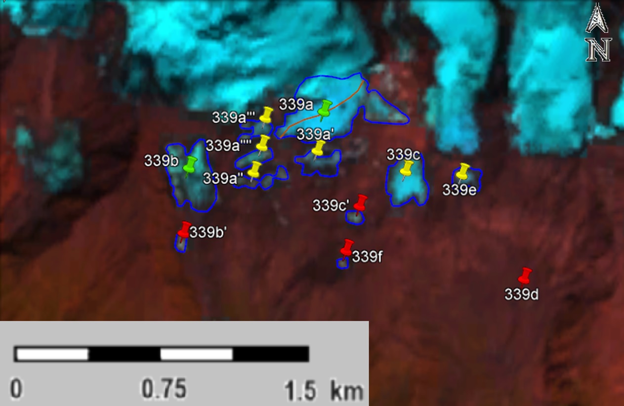 სურ. 4. №339 მყინვარის კონტურები: ა − ტოპოგრაფიული რუკის მიხედვით, ბ − Landsat 5 TM სენსორის 2011 წლის 19 სექტემბრის სურათის მიხედვით, გ − Landsat 8 OLI TIRS სენსორის 2017 წლის 12 სექტემბრის სურათის მიხედვით, დ − Landsat 8 OLI TIRS სენსორის 2020 წლის 11 სექტემბრის სურათის მიხედვით.