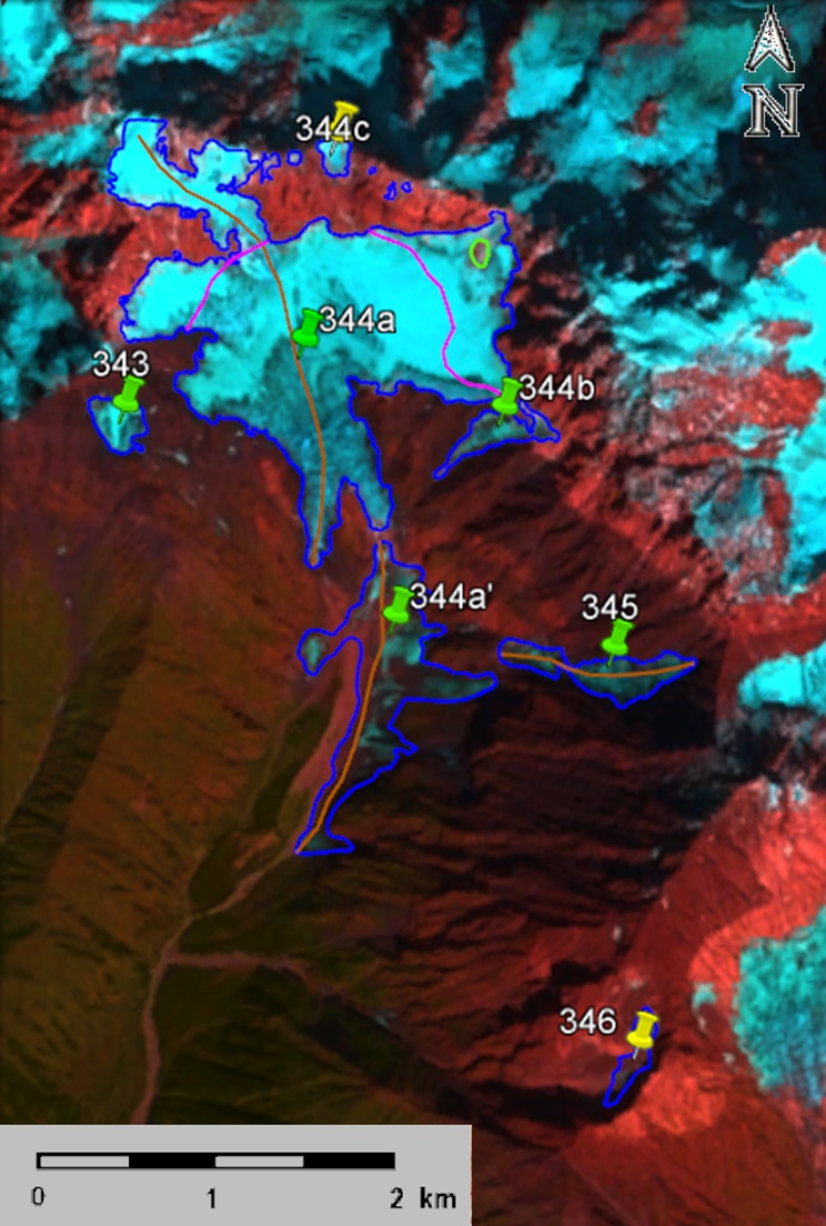 სურ. 7. №343, №344 (ყორულდაში) − 346 მყინვარების კონტურები: ა − ტოპოგრაფიული რუკის მიხედვით, ბ − Landsat 5 TM სენსორის 2011 წლის 11 აგვისტოს სურათის მიხედვით, გ − Landsat 8 OLI TIRS სენსორის 2017 წლის 12 სექტემბრის სურათის მიხედვით, დ − Landsat 8 OLI TIRS სენსორის 2020 წლის 11 სექტემბრის სურათის მიხედვით.