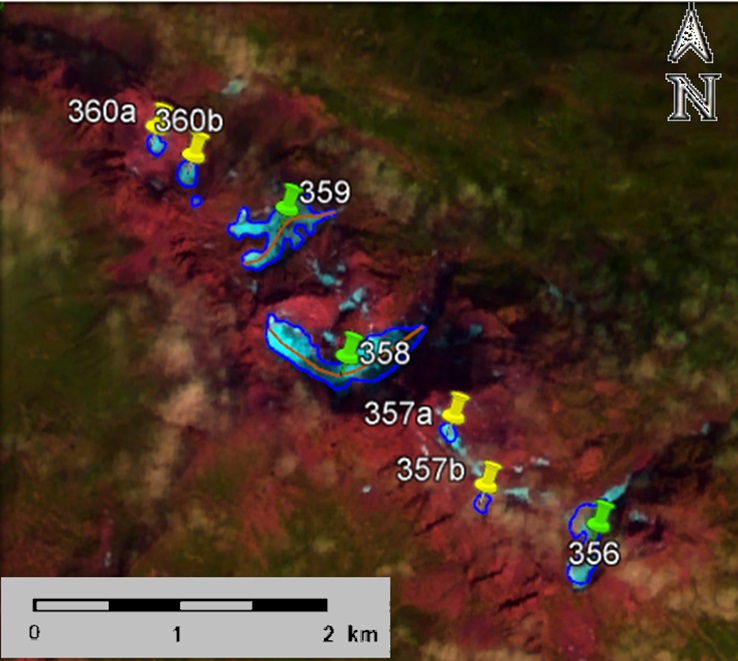 სურ. 10. №356 (კარეტა), №357 (სამერცხლე), №358 (აღმ. ჩუტკარა), №359 ჩუტკარა) და №360 (ლატაშური) მყინვარების კონტურები: ა − ტოპოგრაფიული რუკის მიხედვით, ბ − Landsat 7 ETM+ სენსორის 2011 წლის 20 სექტემბრის სურათის მიხედვით, გ − Landsat 8 OLI TIRS სენსორის 2017 წლის 12 სექტემბრის სურათის მიხედვით, დ − Landsat 8 OLI TIRS სენსორის 2022 წლის 24 სექტემბრის სურათის მიხედვით.