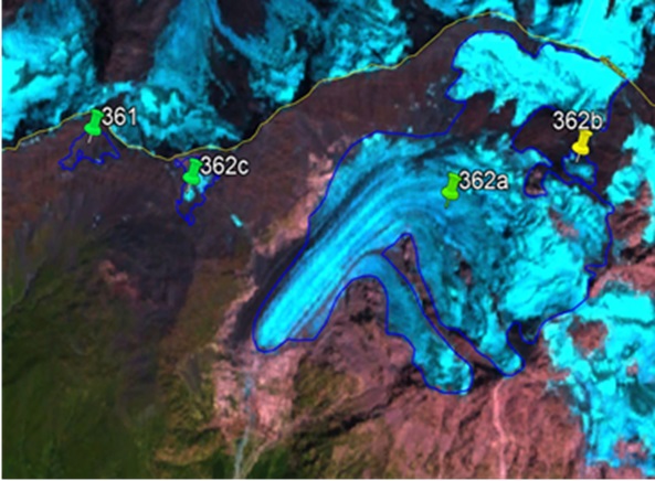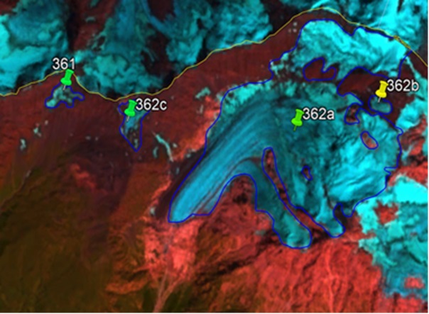სურ. 11. №361 და №362 (ედენა) მყინვარების კონტურები: ა − ტოპოგრაფიული რუკის მიხედვით, ბ − Landsat 7 ETM+ სენსორის 2010 წლის 31 აგვისტოს სურათის მიხედვით, გ − Landsat 8 OLI TIRS სენსორის 2015 წლის 5 სექტემბრის სურათის მიხედვით, დ − Landsat-ის 2020 წლის 11 სექტემბრის სურათის მიხედვით.