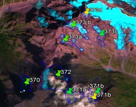 სურ. 15. №370 − 373 მყინვარების კონტურები: ა − ტოპოგრაფიული რუკის მიხედვით, ბ − Landsat 7 ETM+ სენსორის 2010 წლის 31 აგვისტოს სურათის მიხედვით, გ − Landsat 8 OLI TIRS სენსორის 2015 წლის 5 სექტემბრის სურათის მიხედვით, დ − Landsat 8 OLI TIRS სენსორის 2020 წლის 11 სექტემბრის სურათის მიხედვით.
