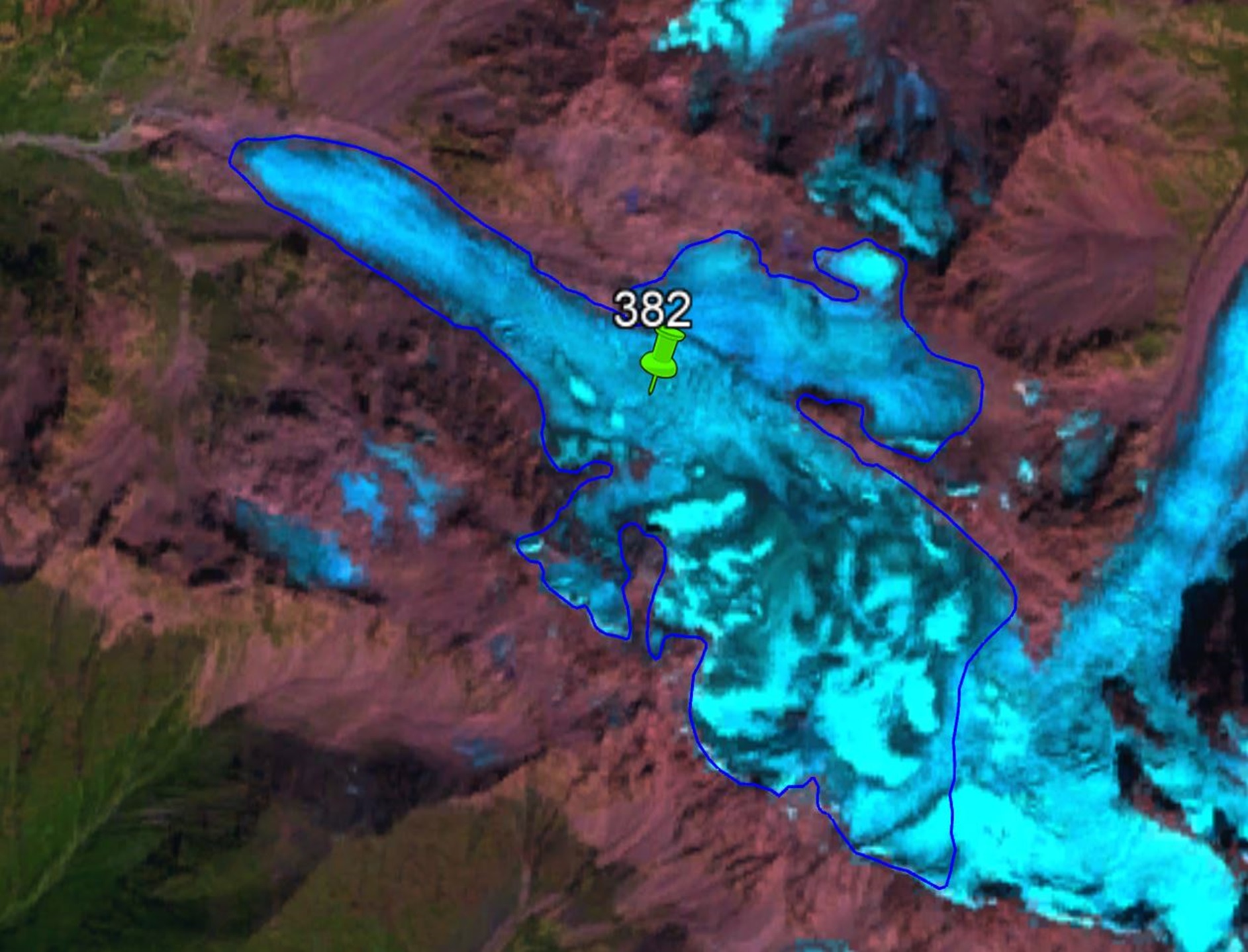 სურ. 18. №382 (კირტიშო) მყინვარის კონტურები: ა − ტოპოგრაფიული რუკის მიხედვით, ბ − Landsat 7 ETM+ სენსორის 2010 წლის 31 აგვისტოს სურათის მიხედვით, გ − Landsat 8 OLI TIRS სენსორის 2015 წლის 5 სექტემბრის სურათის მიხედვით, დ − Landsat 8 OLI TIRS სენსორის 2020 წლის 11 სექტემბრის სურათის მიხედვით.