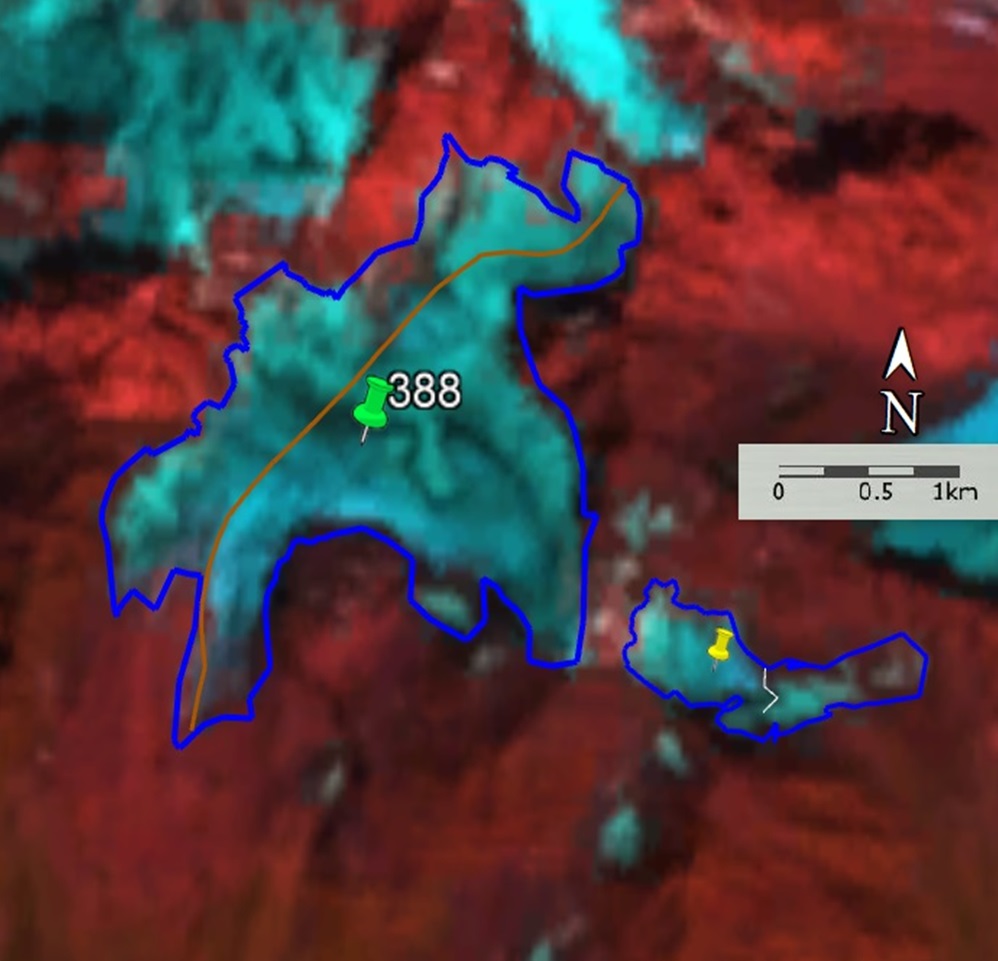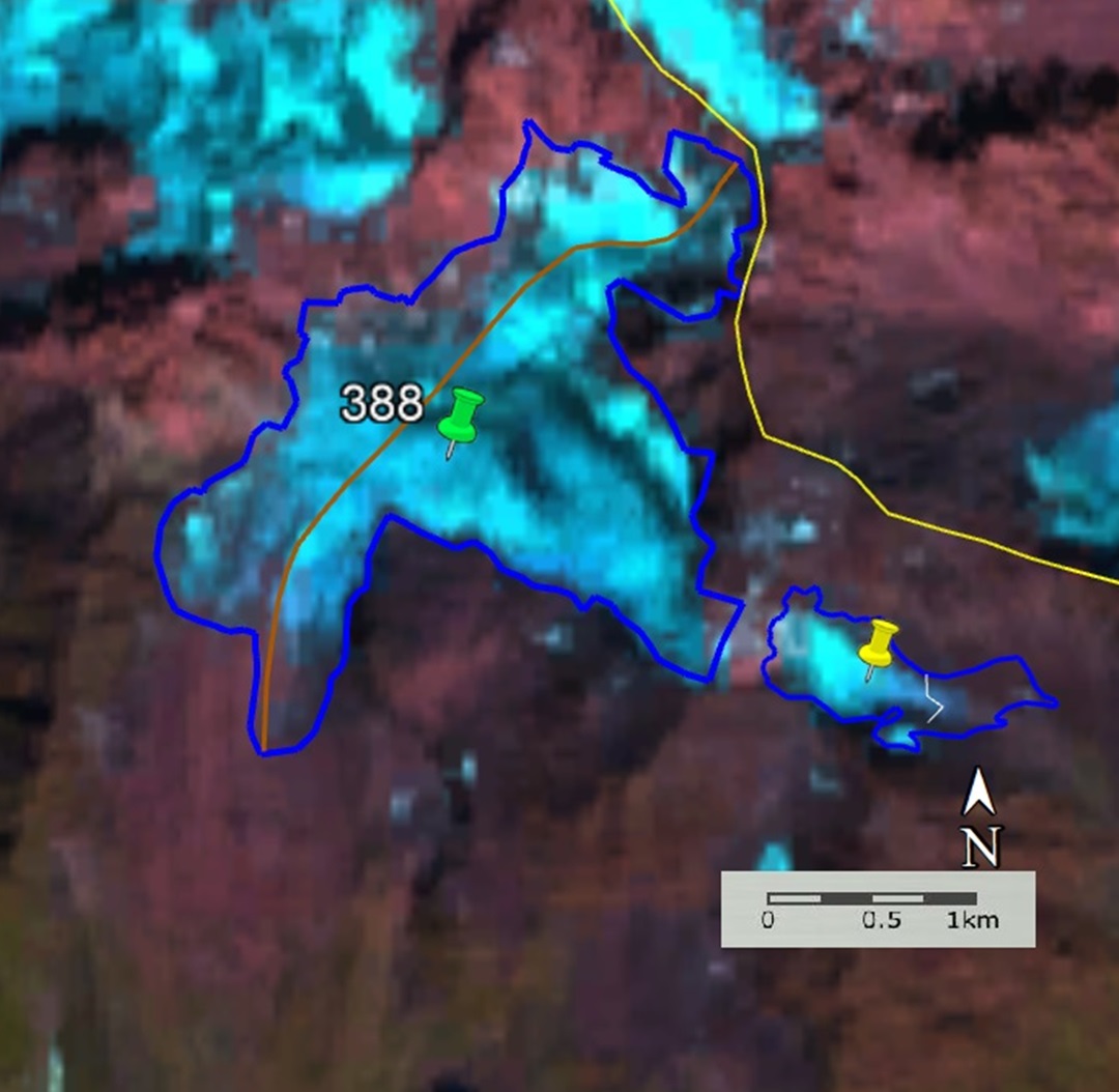 სურ. 21. №388 და აღურიცხავი მყინვარის კონტურები: ა − ტოპოგრაფიული რუკის მიხედვით, ბ − Landsat 7 ETM+ სენსორის 2011 წლის 11 აგვისტოს სურათის მიხედვით, გ − Landsat 8 OLI სენსორის 2017 წლის 12 სექტემბრის სურათის მიხედვით, დ − Landsat 8 OLI TIRS სენსორის 2020 წლის 4 სექტემბრის სურათის მიხედვით.