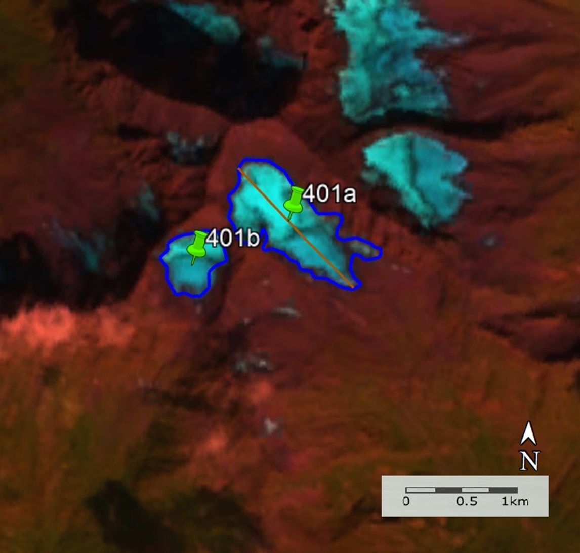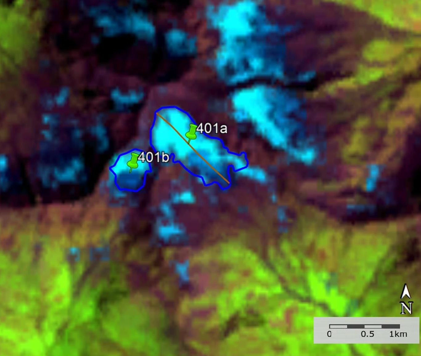 სურ. 28. მდინარე ჯეჯორას №401 (საუხოხი) მყინვარის კონტურები: ა − ტოპოგრაფიული რუკის მიხედვით, ბ − Landsat 7 ETM+ სენსორის 2011 წლის 11 აგვისტოს სურათის მიხედვით, გ − Landsat 8 OLI სენსორის 2017 წლის 12 სექტემბრის სურათის მიხედვით, დ − Landsat 8 OLI TIRS სენსორის 2020 წლის 4 სექტემბრის სურათის მიხედვით.