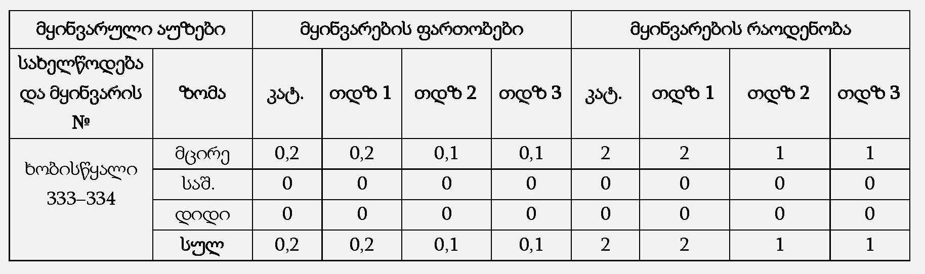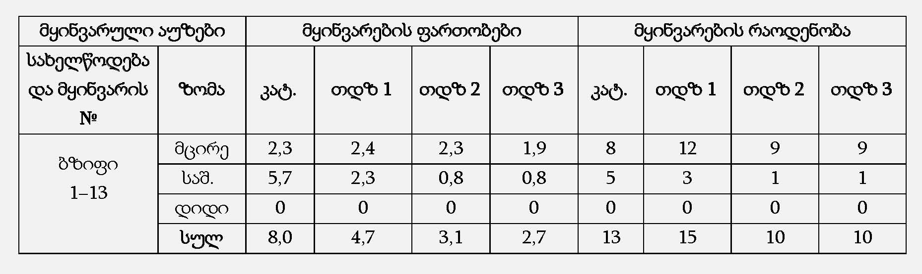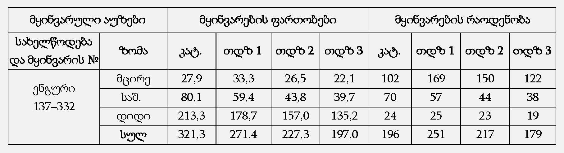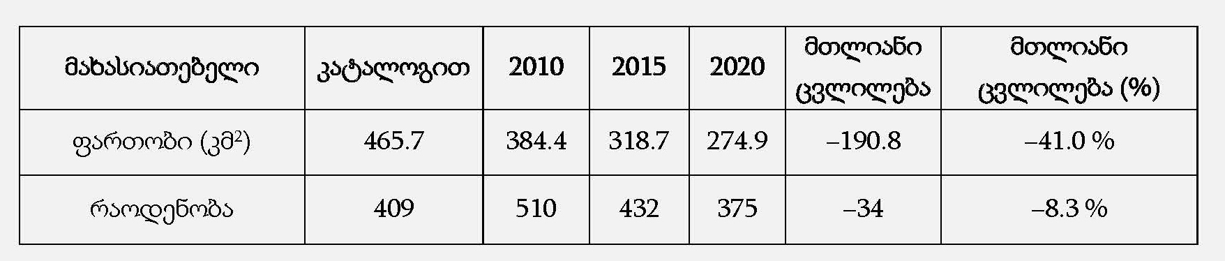 დასავლეთ საქართველოში 6 მყინვარულ აუზში კატალოგის მიხედვით სულ აღრიცხულია 409 მყინვარი. მათი ჯამური ფართობია 465,7 კმ2. 2010 წელს ამ მყინვარების ფართობი გახდა 384,4 კმ2, 2015 წელს − 318,7 კმ2, ხოლო 2020 წელს − 274.9 კმ2. რაც იმას ნიშნავს, რომ მყინვარების საერთო ფართობი 60 წლის განმავლობაში შემცირდა 81.3 კმ2-ით ანუ 17.5 %-ით, კიდევ 5 წლის შემდეგ შემცირდა 17.1 %-ით, ხოლო კიდევ 5 წლის შემდეგ შემცირდა 47.5-ით ანუ 13.7 %-ით. ჯამური ფართობი (კატალოგით) 465.7 კმ2 2020 წლისათვის გახდა 274.9 კმ2 ანუ შემცირდა 190.8 კმ2-ით (41.0 %-ით).
