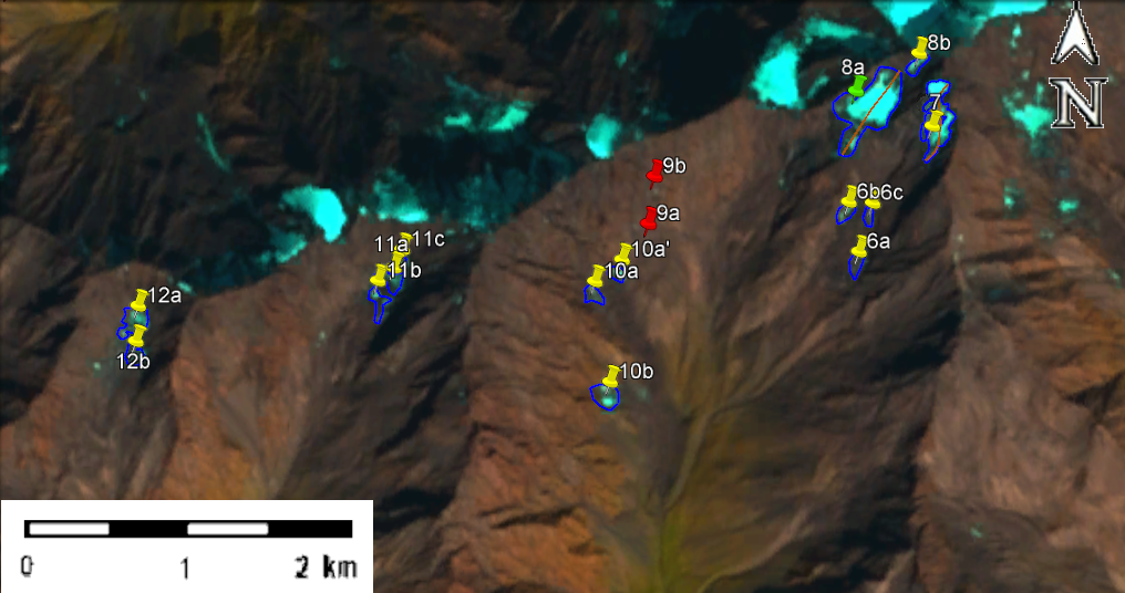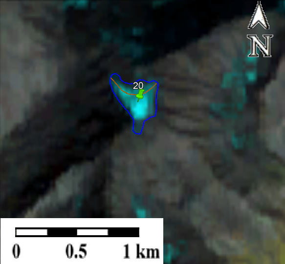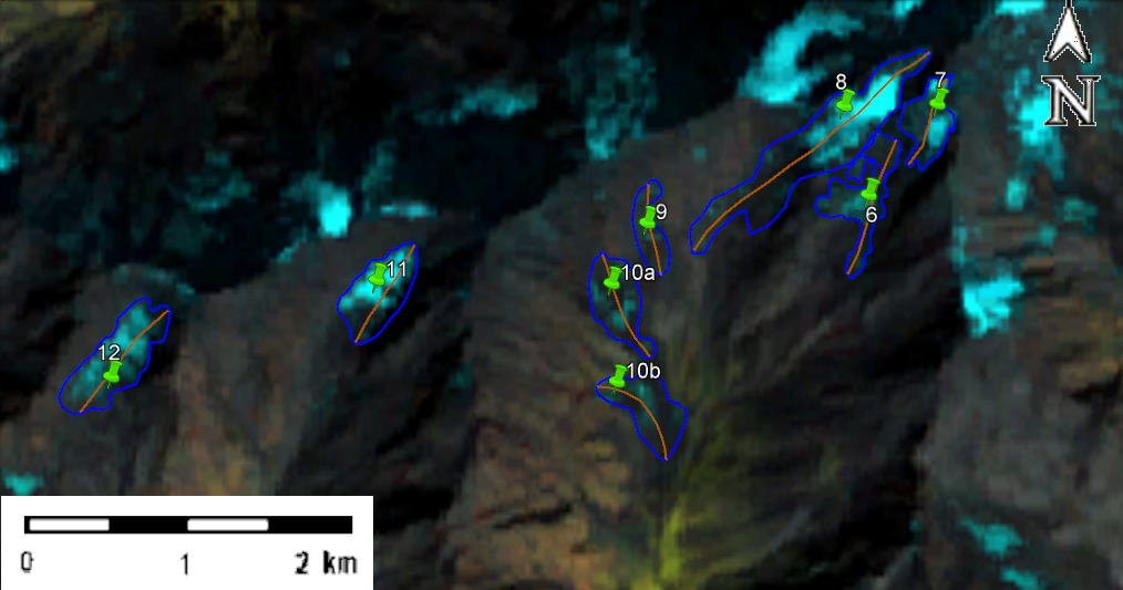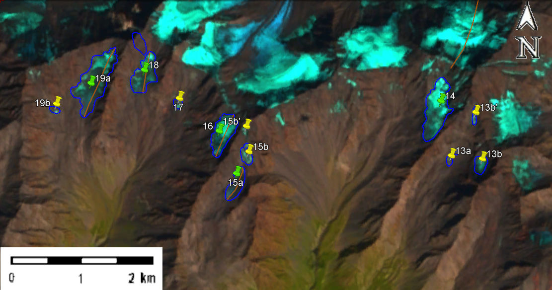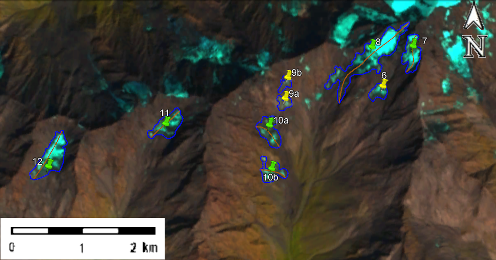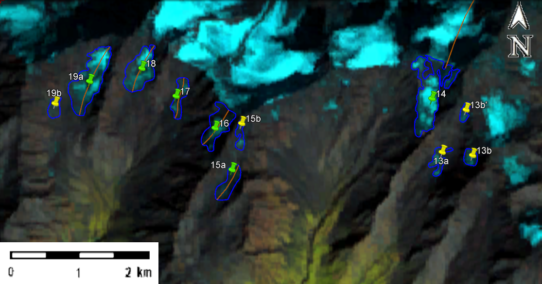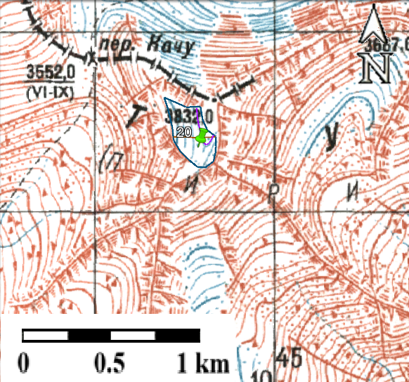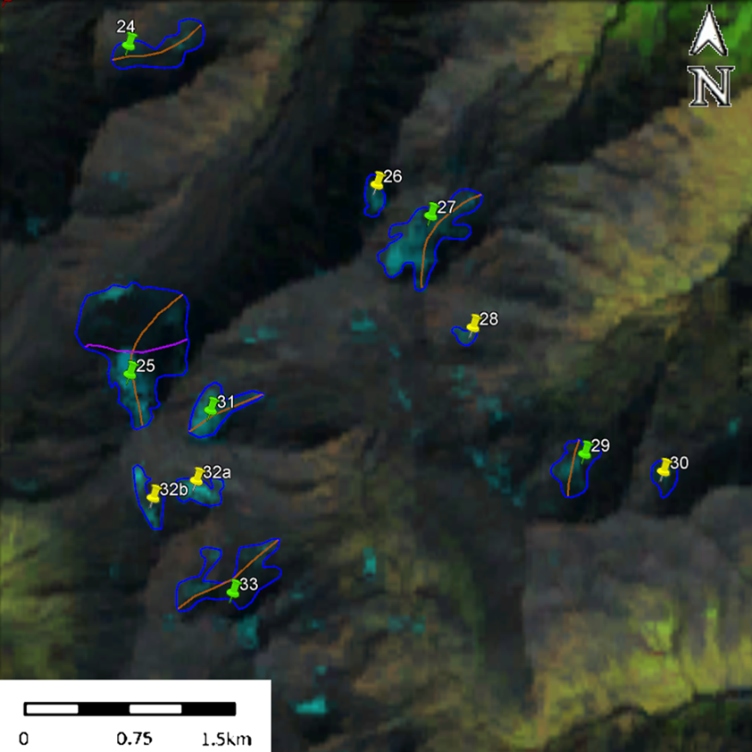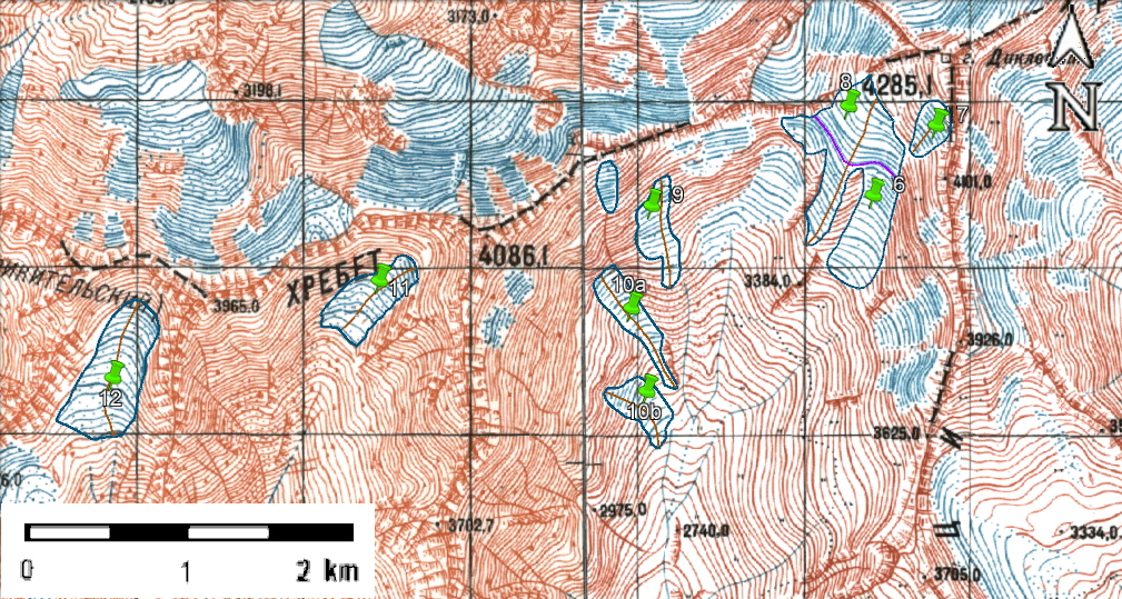 Note: Names of glaciers Nos. 24 – 25 and 27 – 33: 24–Pirchita Glacier; 25–Northern Amugo; 27–Kvakhidi Glacier, 110a; 28–Kvakhidi Glacier, 110b; 29–Kvakhidi Glacier, 110c; 31–Eastern Amugo; 32–Larovani Glacier, 112; 33–Larovani Glacier, 112b.