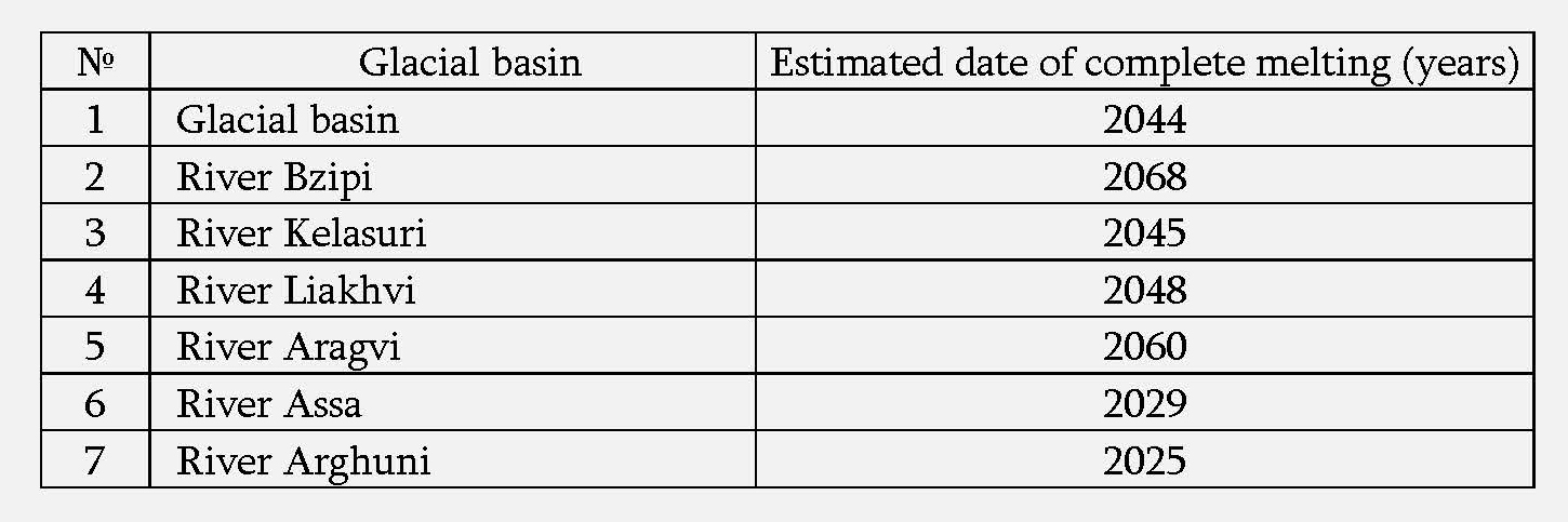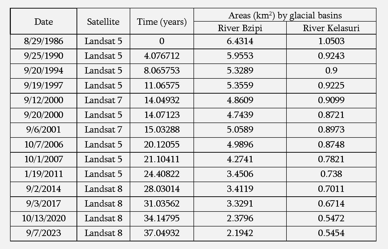 The dynamics of glacier change in the Bzifi and Kelasuri basins The analysis used data from Landsat 5, 7, and 8 satellites for the time interval from 1986 to 2023. Satellite data for fourteen different dates were available for this period. Table 6 shows the total areas of glaciers determined by the SRS by date.