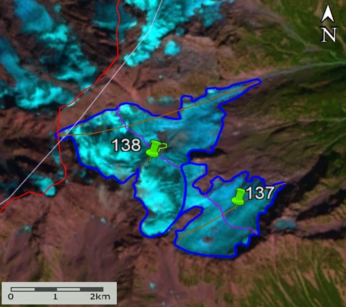 სურ. 1. №137 (ხარიხარა, 143a) და №138 (ხარიხარა, 143b) მყინვარების კონტურები: ა − ტოპოგრაფიული რუკის მიხედვით, ბ − Landsat 7 ETM+ სენსორის 2010 წლის 31 აგვისტოს სურათის მიხედვით, გ − Landsat 8 OLI TIRS სენსორის 2017 წლის 19 სექტემბრის სურათის მიხედვით, დ − Landsat 8 OLI TIRS სენსორის 2020 წლის 11 სექტემბრის სურათის მიხედვით.