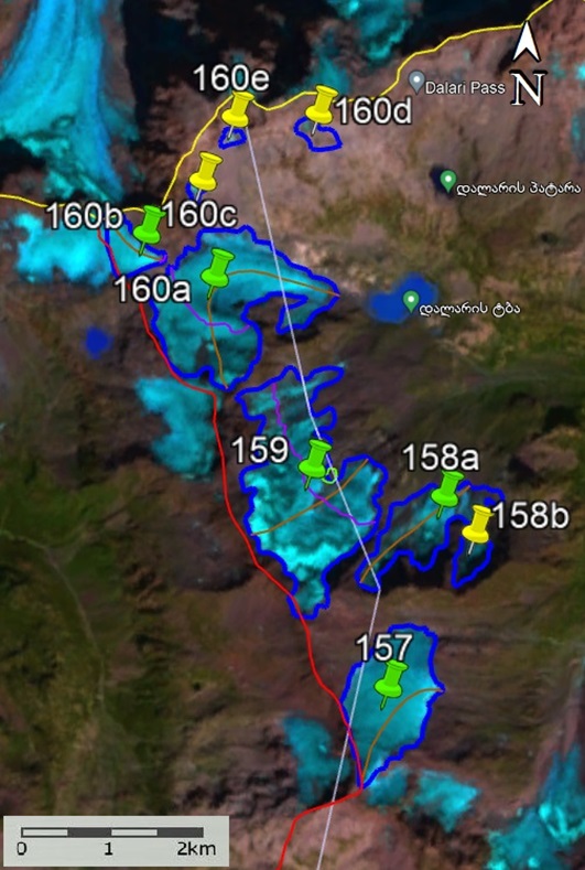 სურ. 6. №157 − 160 მყინვარების კონტურები: ა − ტოპოგრაფიული რუკის მიხედვით, ბ − Landsat 7 ETM+ სენსორის 2010 წლის 31 აგვისტოს სურათის მიხედვით, გ − Landsat 8 OLI TIRS სენსორის 2015 წლის 5 სექტემბრის სურათის მიხედვით, დ − Landsat 8 OLI TIRS სენსორის 2020 წლის 11 სექტემბრის სურათის მიხედვით.