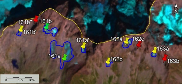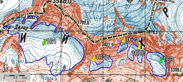 სურ. 7. №161 − 163 მყინვარების კონტურები: ა − ტოპოგრაფიული რუკის მიხედვით, ბ − Landsat 7 ETM+ სენსორის 2010 წლის 31 აგვისტოს სურათის მიხედვით, გ − Landsat 8 OLI TIRS სენსორის 2015 წლის 5 სექტემბრის სურათის მიხედვით, დ − Landsat 8 OLI TIRS სენსორის 2020 წლის 11 სექტემბრის სურათის მიხედვით.