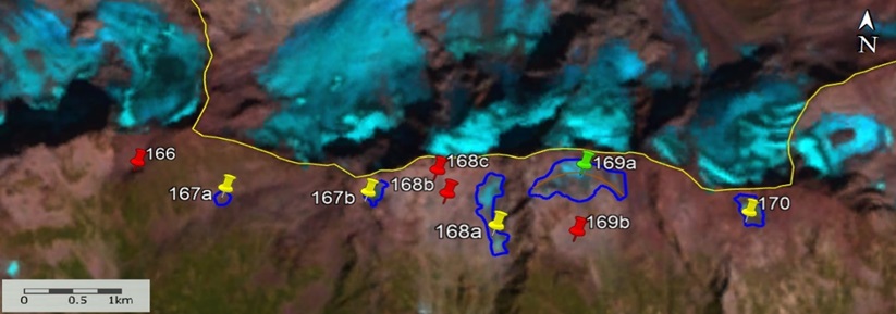 სურ. 9. №166 – 170 მყინვარების კონტურები: ა − ტოპოგრაფიული რუკის მიხედვით, ბ − Landsat 7 ETM+ სენსორის 2010 წლის 31 აგვისტოს სურათის მიხედვით, გ − Landsat 8 OLI TIRS სენსორის 2015 წლის 5 სექტემბრის სურათის მიხედვით, დ − Landsat 8 OLI TIRS სენსორის 2020 წლის 11 სექტემბრის სურათის მიხედვით.