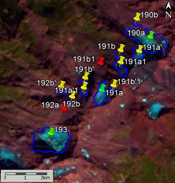 სურ. 15. №190 − 193 მყინვარების კონტურები: ა − ტოპოგრაფიული რუკის მიხედვით, ბ − Landsat 7 ETM+ სენსორის 2010 წლის 31 აგვისტოს სურათის მიხედვით, გ − Landsat 8 OLI TIRS სენსორის 2015 წლის 5 სექტემბრის სურათის მიხედვით, დ − Landsat 8 OLI TIRS სენსორის 2020 წლის 11 სექტემბრის სურათის მიხედვით.