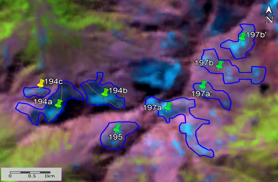 სურ. 16. №194, №195 (ჩრდ. კირარი) და №197 (კოკრინაჩკურა) მყინვარების კონტურები: ა − ტოპოგრაფიული რუკის მიხედვით, ბ − Landsat 7 ETM+ სენსორის 2010 წლის 31 აგვისტოს სურათის მიხედვით, გ − Landsat 8 OLI TIRS სენსორის 2015 წლის 5 სექტემბრის სურათის მიხედვით, დ − Landsat 8 OLI TIRS სენსორის 2020 წლის 11 სექტემბრის სურათის მიხედვით.