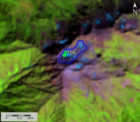 სურ. 17. №196 (კირარი) მყინვარის კონტურები: ა − ტოპოგრაფიული რუკის მიხედვით, ბ − Landsat 7 ETM+ სენსორის 2010 წლის 31 აგვისტოს სურათის მიხედვით, გ − Landsat 8 OLI სენსორის 2015 წლის 5 სექტემბრის სურათის მიხედვით, დ − Landsat 8 OLI TIRS სენსორის 2020 წლის 11 სექტემბრის სურათის მიხედვით.