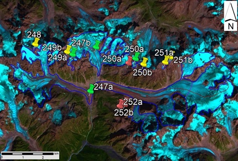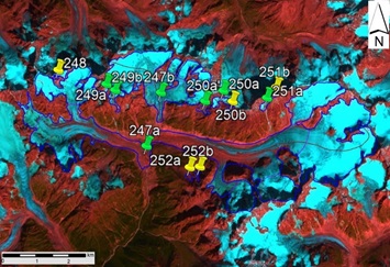 სურ. 34. №247 − 252 მყინვარების კონტურები: ა − ტოპოგრაფიული რუკის მიხედვით, ბ − Landsat 7 ETM+ სენსორის 2010 წლის 31 აგვისტოს სურათის მიხედვით, გ − Landsat 8 OLI TIRS სენსორის 2015 წლის 5 სექტემბრის სურათის მიხედვით, დ − Landsat 8 OLI TIRS სენსორის 2020 წლის 11 სექტემბრის სურათის მიხედვით.