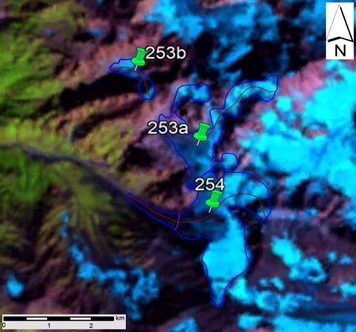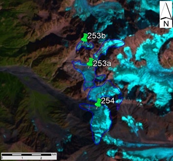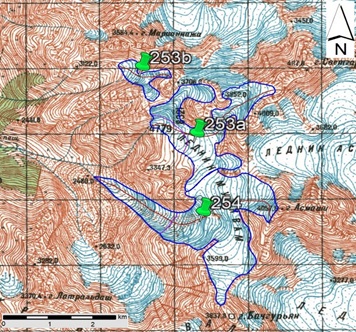 სურ. 35. №253 (მურყვამი) და №254 მყინვარების კონტურები: ა − ტოპოგრაფიული რუკის მიხედვით, ბ − Landsat 7 ETM+ სენსორის 2010 წლის 31 აგვისტოს სურათის მიხედვით, გ − Landsat 8 OLI TIRS სენსორის 2015 წლის 5 სექტემბრის სურათის მიხედვით, დ − Landsat 8 OLI TIRS სენსორის 2020 წლის 11 სექტემბრის სურათის მიხედვით.
