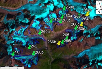 სურ. 37. №260 (№260a-ტვიბერი, №260b-სერი, №260c-სერი, №260d-ძინალი, №260e-ლიჭადი, №260f-თოთი) და №261 − 266 მყინვარების კონტურები: ა − ტოპოგრაფიულ რუკაზე, ბ − Landsat 7 ETM+ სენსორის 2010 წლის 31 აგვისტოს სურათის მიხედვით, გ − Landsat 8 OLI TIRS სენსორის 2015 წლის 5 სექტემბრის სურათის მიხედვით და დ − Landsat 8 OLI TIRS სენსორის 2020 წლის 11 სექტემბრის სურათის მიხედვით.