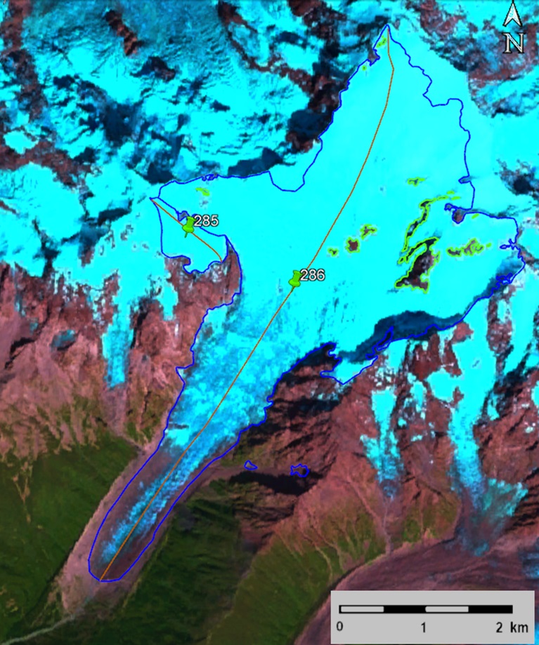 სურ. 42. №285 და №286 (ადიში) მყინვარების კონტურები: ა − ტოპოგრაფიული რუკის მიხედვით, ბ − Landsat 5 TM სენსორის 2011 წლის 19 სექტემბრის სურათის მიხედვით, გ − Landsat 8 OLI TIRS სენსორის 2017 წლის 12 სექტემბრის სურათის მიხედვით, დ − Landsat 8 OLI TIRS სენსორის 2020 წლის 4 სექტემბრის სურათის მიხედვით.