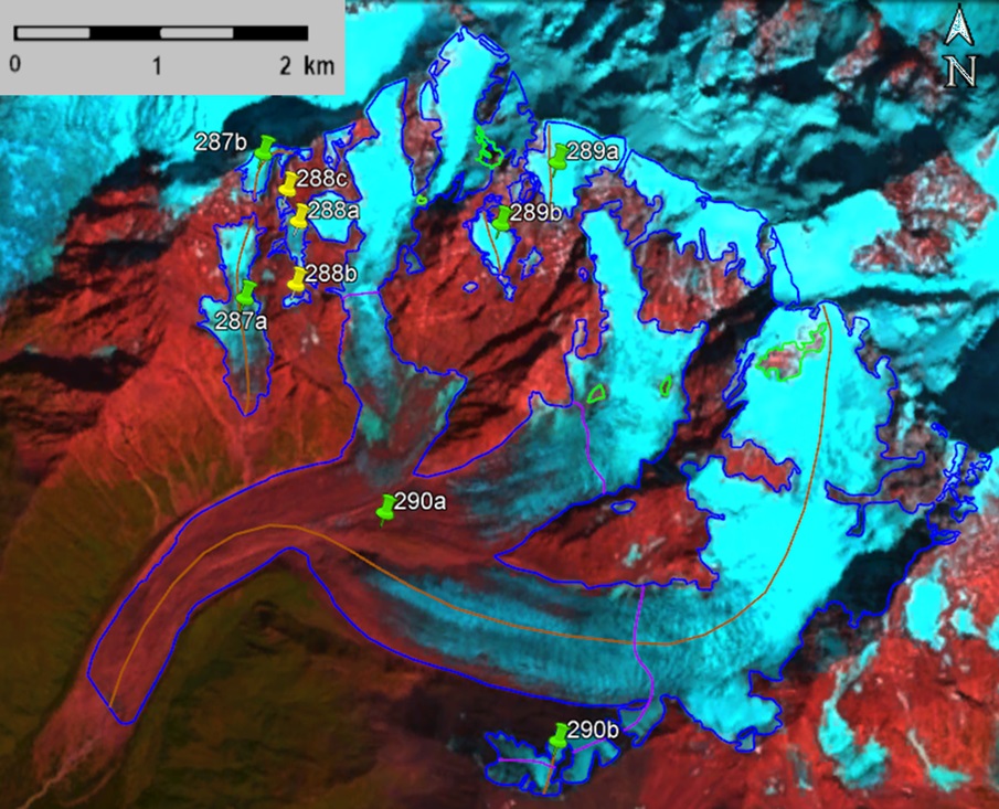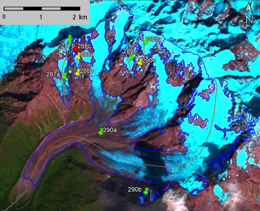 სურ. 43. №287 − 290 (ხალდე) მყინვარების კონტურები: ა − ტოპოგრაფიული რუკის მიხედვით, ბ − Landsat 5 TM სენსორის 2010 წლის 24 აგვისტოს სურათის მიხედვით, გ − Landsat 8 OLI TIRS სენსორის 2017 წლის 12 სექტემბრის სურათის მიხედვით, დ − Landsat 8 OLI TIRS სენსორის 2020 წლის 20 სექტემბრის სურათის მიხედვით.