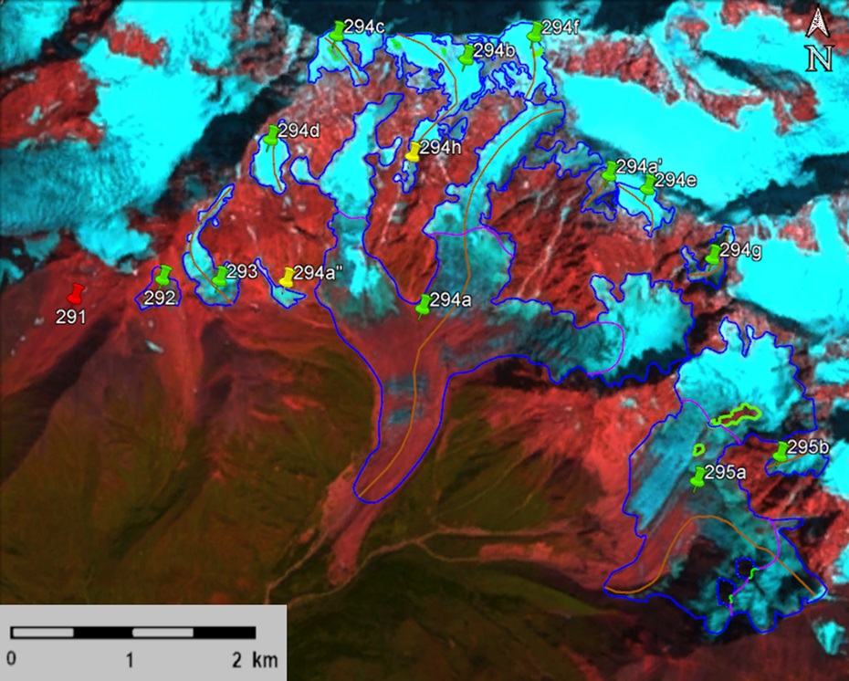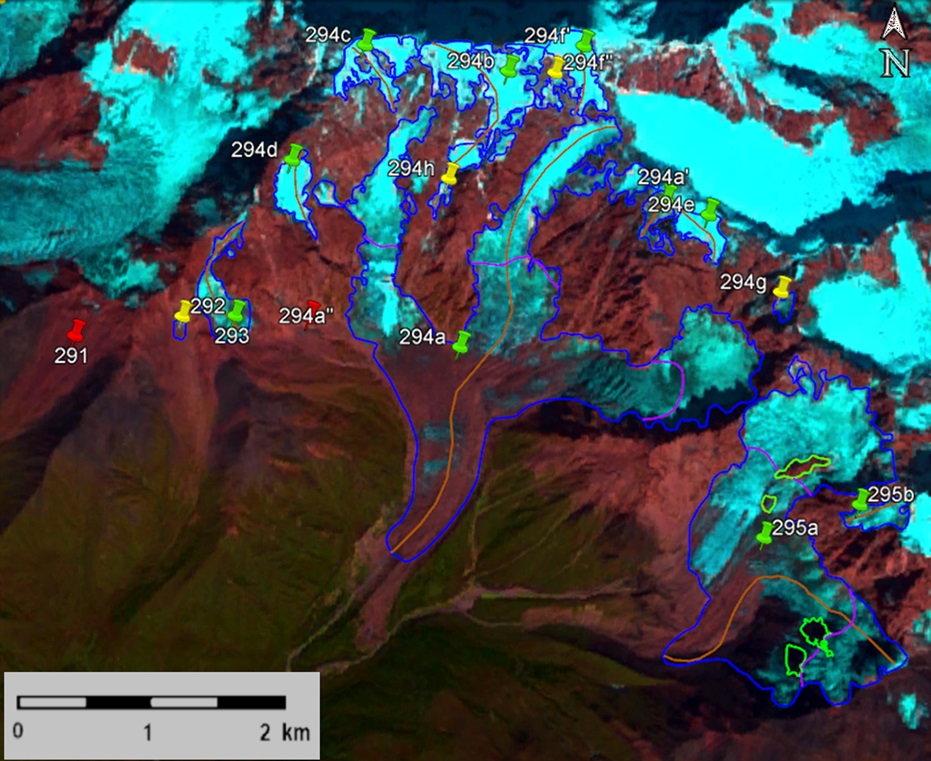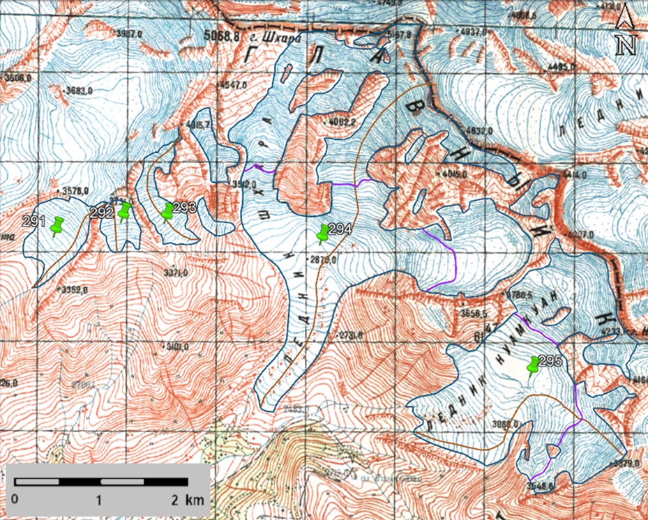 სურ. 44. №291 (კარეტა) − 294 (შხარა) და №295 (ნამყვამი) მყინვარების კონტურები: ა − ტოპოგრაფიული რუკის მიხედვით, ბ − Landsat 5 TM სენსორის 2010 წლის 24 აგვისტოს სურათის მიხედვით, გ − Landsat 8 OLI TIRS სენსორის 2017 წლის 12 სექტემბრის სურათის მიხედვით, დ − Landsat 8 OLI TIRS სენსორის 2020 წლის 20 სექტემბრის სურათის მიხედვით.