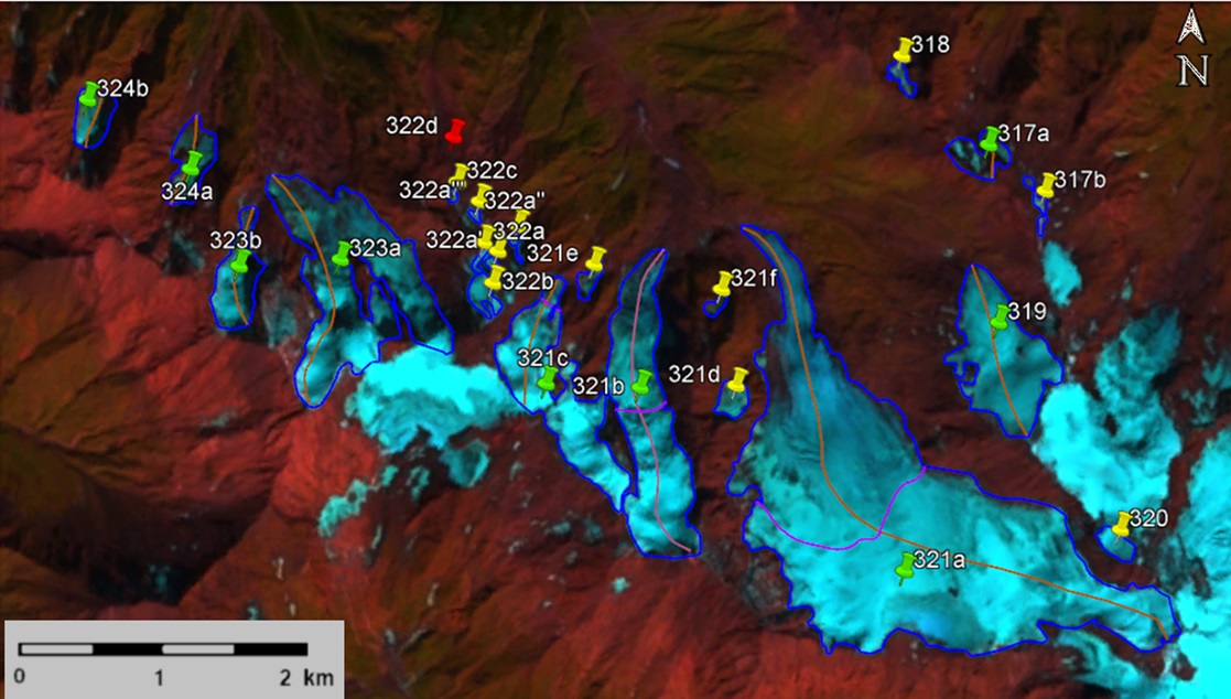 სურ. 48. №317 − 321 (ლაილა c) და №322 − 324 მყინვარების კონტურები: ა − ტოპოგრაფიული რუკის მიხედვით, ბ − Landsat 5 TM სენსორის 2011 წლის 19 სექტემბრის სურათის მიხედვით, გ − Landsat 8 OLI TIRS სენსორის 2017 წლის 12 სექტემბერის სურათის მიხედვით, დ − Landsat 8 OLI TIRS სენსორის 2020 წლის 11 სექტემბრის სურათის მიხედვით.