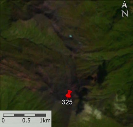 სურ. 49. №325 მყინვარის კონტურები: ა − ტოპოგრაფიული რუკის მიხედვით, ბ − Landsat 5 TM სენსორის 2010 წლის 23 აგვისტოს სურათის მიხედვით, გ − Landsat 8 OLI TIRS სენსორის 2017 წლის 12 სექტემბერის სურათის მიხედვით, დ − Landsat 8 OLI TIRS სენსორის 2020 წლის 11 სექტემბრის სურათის მიხედვით.