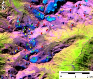 სურ. 14. №101, №102 (გვანდრა) − №107, №113 − 116 მყინვარების კონტურები: ა − ტოპოგრაფიულ რუკაზე, ბ − Landsat 7 ETM+ სენსორის 2010 წლის 11 სექტემბერის სურათის მიხედვით, გ − Landsat 7 ETM+ სენსორის 2015 წლის 6 სექტემბერის სურათის მიხედვით, დ − Landsat 8 OLI TIRS სენსორის 2020 წლის 11 სექტემბერის სურათის მიხედვით.