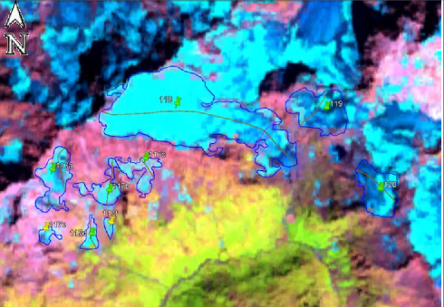 სურ. 16. №117 − 118 (საკენი), №119, №120 მყინვარების კონტურები: ა − ტოპოგრაფიულ რუკაზე, ბ − Landsat 5 TM სენსორის 2010 წლის 31 აგვისტოს სურათის მიხედვით, გ − Landsat 8 OLI TIRS სენსორის 2015 წლის 29 აგვისტოს სურათის მიხედვით, დ − Landsat 8 OLI TIRS სენსორის 2020 წლის 11 სექტემბერის სურათის მიხედვით.