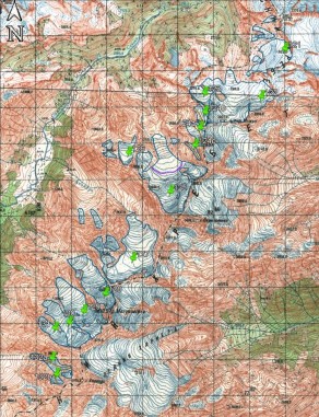 სურ. 17. №121 − 125 (ჩეპარა), №126 − 132 (დას. ხარიხარა) მყინვარების კონტურები: ა − ტოპოგრაფიულ რუკაზე, ბ − Landsat 5 TM სენსორის 2010 წლის 31 აგვისტოს სურათის მიხედვით, გ − Landsat 8 OLI TIRS სენსორის 2013 წლის 23 აგვისტოს სურათის მიხედვით, დ − Landsat 8 OLI TIRS სენსორის 2020 წლის 11 სექტემბერის სურათის მიხედვით.