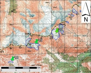 სურ. 2. №18 (ჩეგალი) − 20 მყინვარების კონტურები: ა − ტოპოგრაფიულ რუკაზე, ბ − Landsat 7 ETM+ სენსორის 2010 წლის 31 აგვისტოს სურათის მიხედვით, გ − Landsat 8 OLI სენსორის 2015 წლის 5 სექტემბრის სურათის მიხედვით, დ − Landsat-ის 8 OLI TIRS სენსორის 2020 წლის 11 სექტემბრის სურათის მიხედვით.