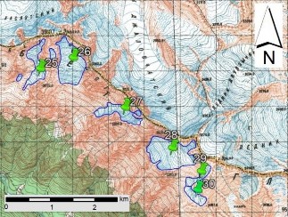 სურ. 4. №25 − 30 მყინვარების კონტურები: ა − ტოპოგრაფიულ რუკაზე, ბ − Landsat 7 ETM+ სენსორის 2010 წლის 31 აგვისტოს სურათის მიხედვით, გ − Landsat 8 OLI სენსორის 2015 წლის 5 სექტემბრის სურათის მიხედვით, დ − Landsat-ის 8 OLI TIRS სენსორის 2020 წლის 11 სექტემბრის სურათის მიხედვით.