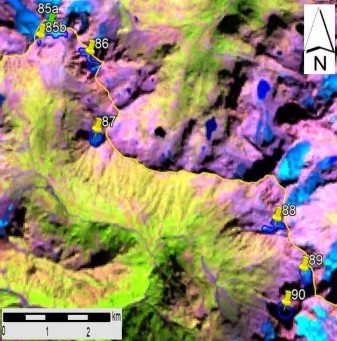 სურ. 11. №85 − 90 მყინვარების კონტურები: ა − ტოპოგრაფიულ რუკაზე, ბ − Landsat 7 ETM+ სენსორის 2010 წლის 31 აგვისტოს სურათის მიხედვით, გ − Landsat 7 ETM+ სენსორის 2015 წლის 6 სექტემბრის სურათის მიხედვით, დ − Landsat 8 OLI TIRS სენსორის 2020 წლის 11 სურათის მიხედვით.