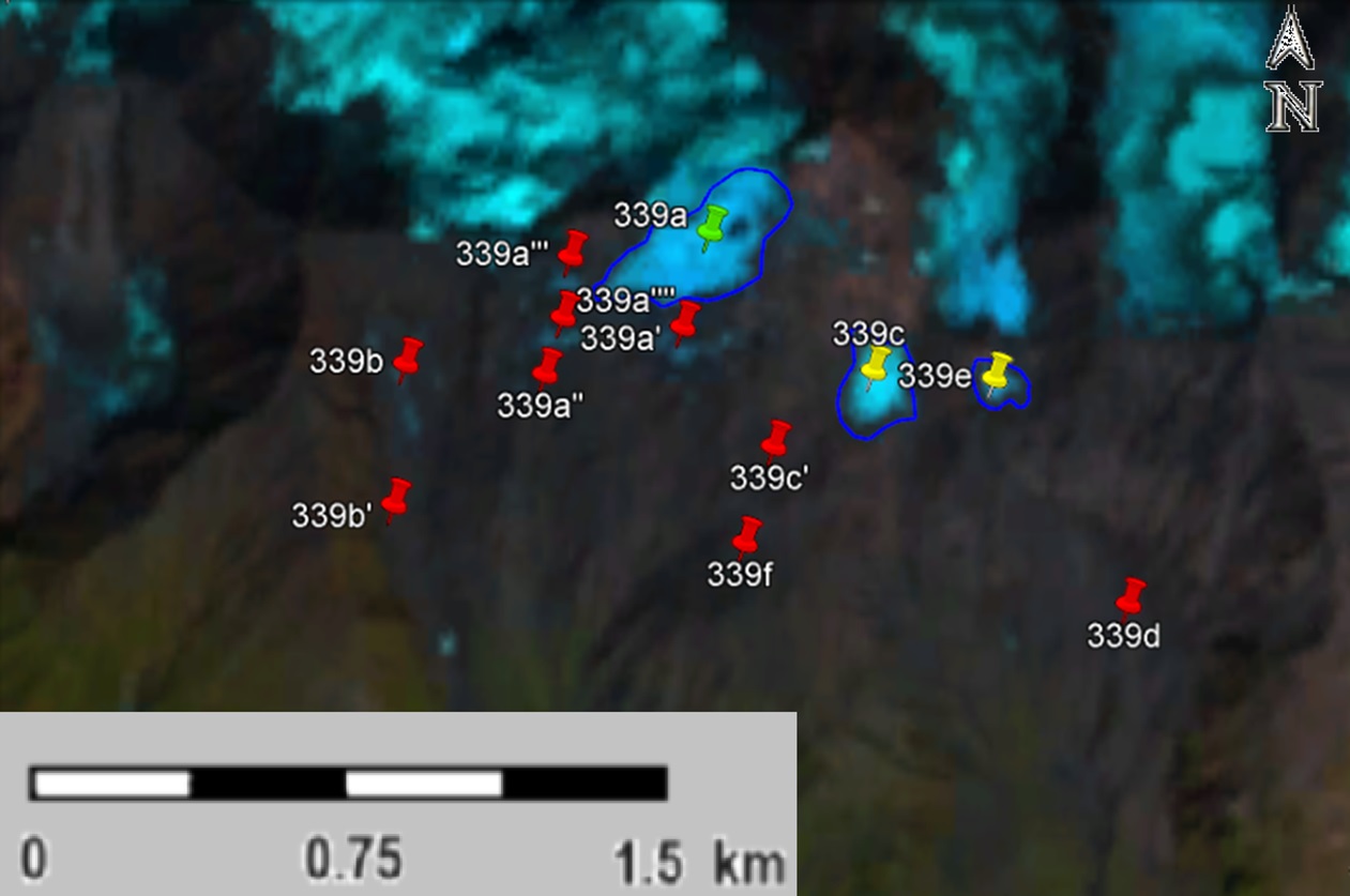 სურ. 4. №339 მყინვარის კონტურები: ა − ტოპოგრაფიული რუკის მიხედვით, ბ − Landsat 5 TM სენსორის 2011 წლის 19 სექტემბრის სურათის მიხედვით, გ − Landsat 8 OLI TIRS სენსორის 2017 წლის 12 სექტემბრის სურათის მიხედვით, დ − Landsat 8 OLI TIRS სენსორის 2020 წლის 11 სექტემბრის სურათის მიხედვით.