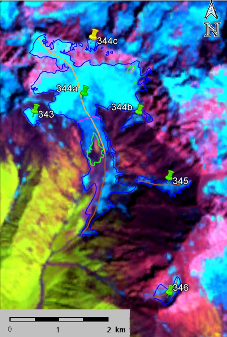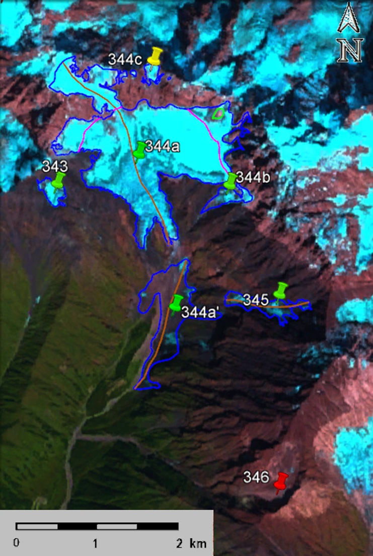სურ. 7. №343, №344 (ყორულდაში) − 346 მყინვარების კონტურები: ა − ტოპოგრაფიული რუკის მიხედვით, ბ − Landsat 5 TM სენსორის 2011 წლის 11 აგვისტოს სურათის მიხედვით, გ − Landsat 8 OLI TIRS სენსორის 2017 წლის 12 სექტემბრის სურათის მიხედვით, დ − Landsat 8 OLI TIRS სენსორის 2020 წლის 11 სექტემბრის სურათის მიხედვით.